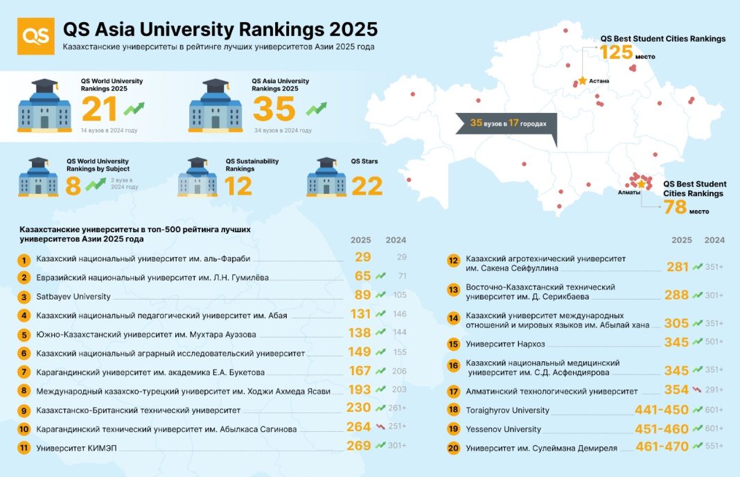 The QS Asia University Rankings 2025 evaluated 985 universities from 25 countries and territories. Kazakh universities competed strongly among institutions from India, China, Japan, and South Korea.
