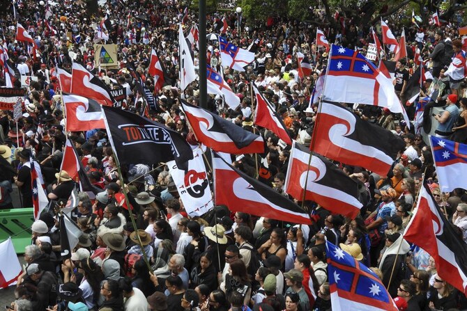 Thousands of people gather outside New Zealand's parliament to protest a proposed law that would redefine the country's founding agreement between Indigenous MÄ'ori and the British Crown, in Wellington.