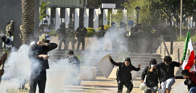 Protesters run from police as they use tear gas and flash-bangs at the Federal Building in Santa Ana, California, on June 9, 2025