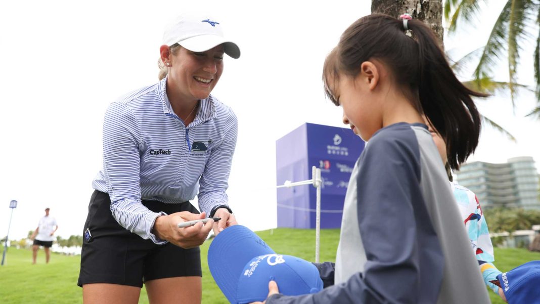 Bailey Tardy of The United States signs autograph on 18th green during the second round of the Blue Bay LPGA at Jian Lake Blue Bay Golf Course on March 08, 2024 in Hainan Island, Hainan.