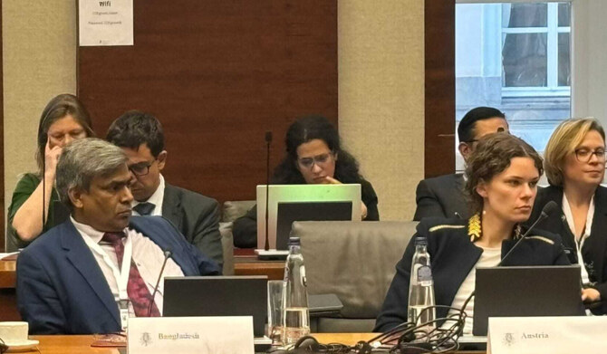 Md. Shafiqur Rahman, director general of the Bangladeshi foreign ministry’s West Asia wing, left, leads a delegation to a Global Alliance for the Implementation of the Two-State Solution in Brussels on Nov. 28, 2024. (Bangladesh MoFA)
