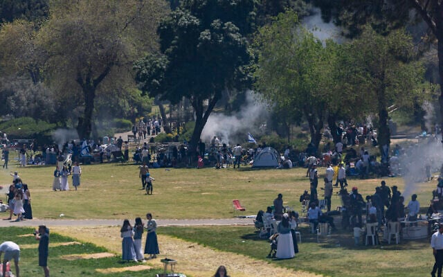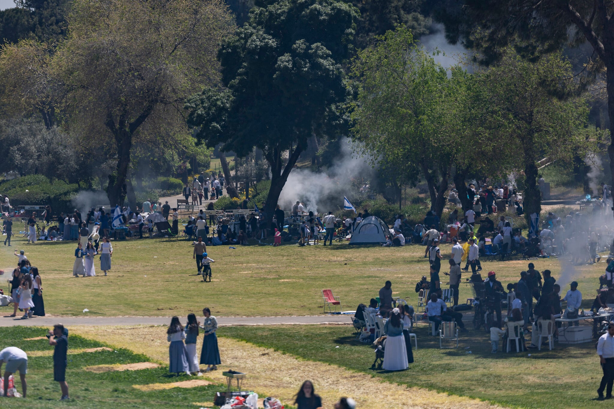 On the Tel Aviv promenade, thousands packed the beaches, enjoying the mild April sunshine and cool Mediterranean Sea. At the nearby seaside Charles Clore Park, hundreds of people attended family barbecues and cookouts, with the smoke and smell of grilled meat filling the air.