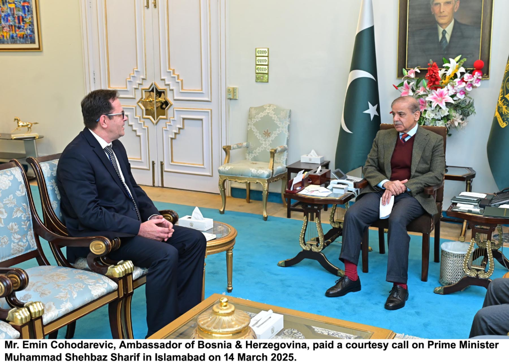 Islamabad – Mr. Emin Cohodarevic, Ambassador of Bosnia & Herzegovina, paid a courtesy call on Prime Minister Muhammad Shehbaz Sharif at the Prime Minister’s House, earlier today. During the meeting, the Prime Minister highlighted the warm and brotherly relations between Pakistan and Bosnia & Herzegovina and fondly recalled the visits to Bosnia & Herzegovina by former Prime Minister Muhammad Nawaz Sharif.