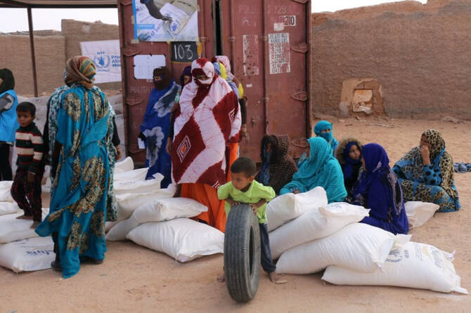 Sahrawi refugees wait for food at Laayoune camp in Algeria.