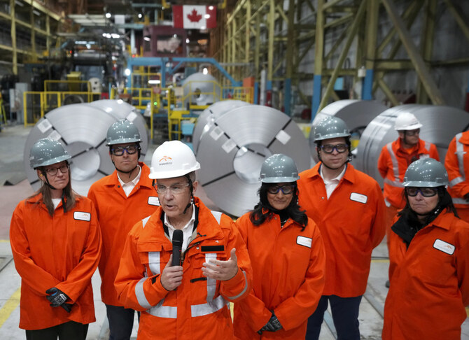 Canadian Prime Minister designate Mark Carney, left, tours the ArcelorMittal Dofasco steel plant in Hamilton, Ontario, on March 12, 2025.