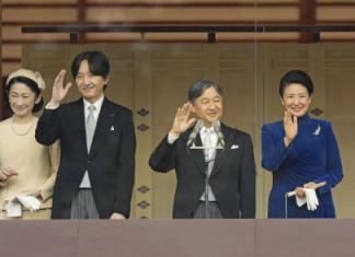 Japanese Emperor Naruhito (3rd from R), alongside Empress Masako, waves to well-wishers from a...