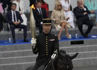 PARIS — Paris hosted an extra-special guest for France’s national holiday Sunday — the Olympic flame lighting up the city’s grandiose military parade for Bastille Day.