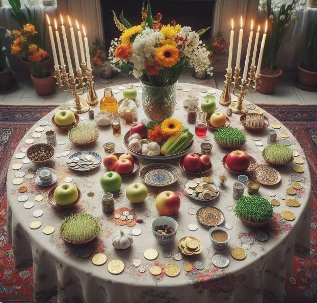 The Haft-Siin table may also include a mirror, candles, painted eggs, a bowl of water, goldfish, coins, hyacinth, and traditional confectioneries. The Holy Book of Quran and Hafez Divan is also included for the Muslims.