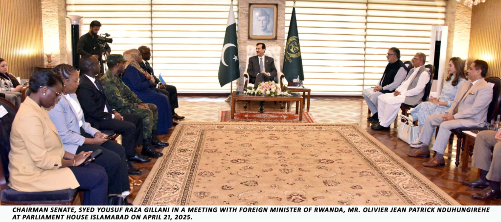 Islamabad – Rwanda’s Foreign Minister called on with Chairman Senate Syed Yousuf Raza Gilani at the Parliament House in Islamabad. The Chairman warmly welcomed the Foreign Minister. Syed Yousuf Raza Gilani stated that Pakistan values its relationship with Rwanda and that these relations have grown over time. He noted that Pakistan has shared a draft Memorandum of Understanding (MoU) for strategic partnership with the East African Community (EAC), and Rwanda’s support in this regard holds great importance. He further stated that NADRA has successfully completed digital identity documentation projects in Nigeria, Sudan, Kenya, and Somalia, and Pakistan is ready to offer similar services to Rwanda.
