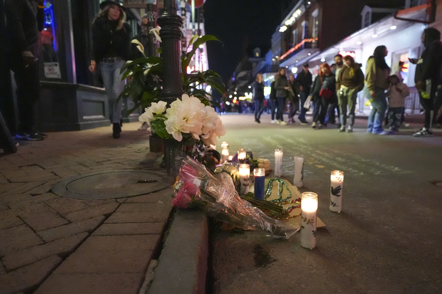 A memorial on Bourbon Street is seen at the site of a deadly truck attack on New Year’s Day in New Orleans, Friday, Jan. 3, 2025.