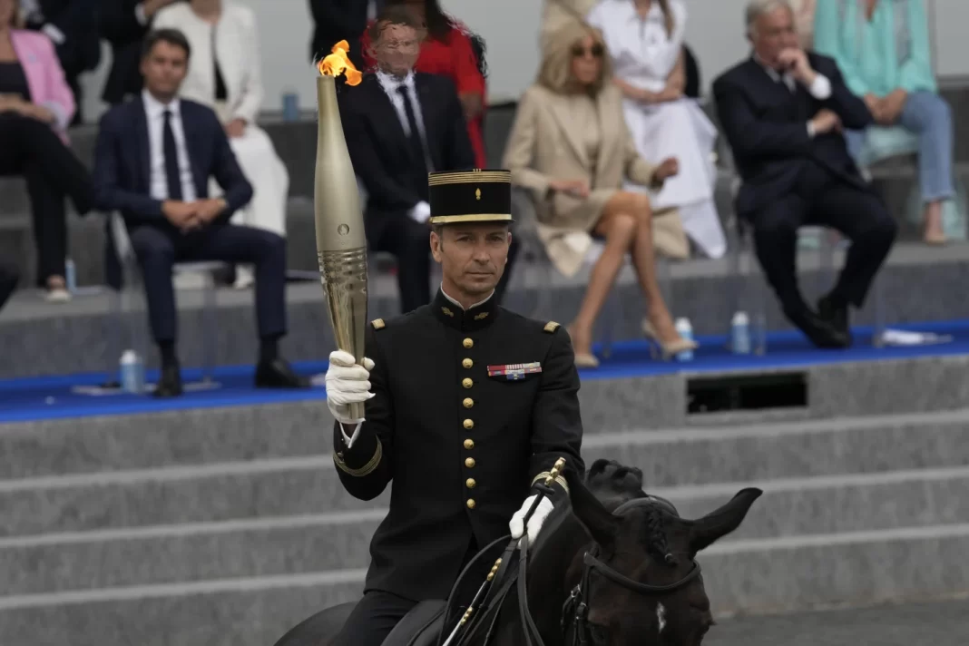 The first torchbearer was Col. Thibault Vallette, equestrian gold medalist in the 2016 Rio Olympics, who passed it on to a group of young athletes smiling broadly as they passed it hand-to-hand in front of the presidential tribune.