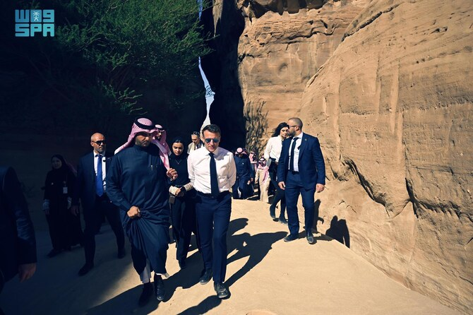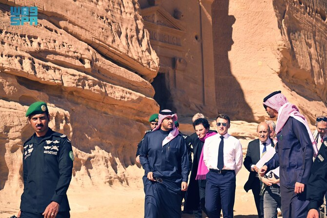 Accompanied by the Minister of Foreign Affairs Prince Faisal bin Farhan, Macron began his tour at Hegra, the ancient Nabataean city known for its spectacular stone-carved landmarks, Saudi Press Agency reported.