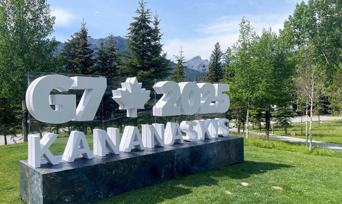 A landmark sign of the G7 2025 logo is seen on the lawn of the Pomeroy Kananaskis Mountain Lodge