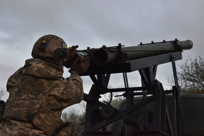 A Ukrainian serviceman prepares to fire a rocket system in Zaporizhzhia, Ukraine.