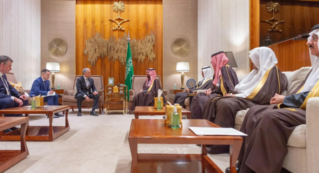 His Royal Highness Prince Mohammed bin Salman bin Abdulaziz Al-Saud, Crown Prince, Prime Minister of the Kingdom of Saudi Arabia, met today with Russian State Duma Speaker Vyacheslav Volodin, with whom he discussed ties and ways to boost parliamentary cooperation.