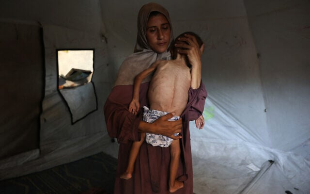 Hidaya, a 31-year-old Palestinian mother, cradles her sick 18-month-old son Mohammed al-Mutawaq, who is also displaying signs of malnutrition, inside their tent at the Al-Shati refugee camp, west of Gaza City, on July 24, 2025.
