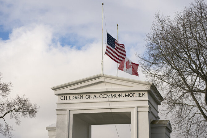 Flags fly above the Peace Arch monument on the border between the United States and Canada at Peace Arch Park on February 1, 2025 in Blaine, Washington. President Trump wants Canada to become the 51st US state.