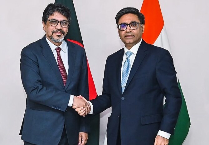 India's foreign secretary Vikram Misri shaking hands with his Bangladesh's counterpart Mohammad Jashim Uddin (L) during a meeting in Dhaka.