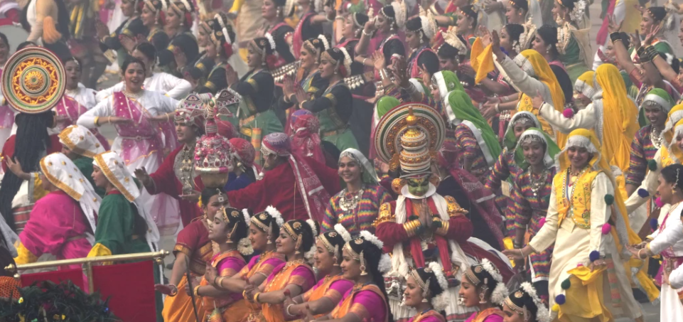 Indians cheered hundreds of men and women in colorful costumes as they played marches, performed traditional dances and pulled motorbike stunts during India’s Republic Day parade in New Delhi on Friday.
