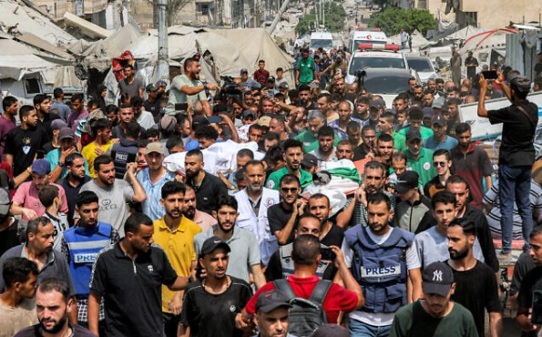 The bodies, wrapped in white shrouds with their faces exposed, were carried through narrow alleys to their graves by mourners, including men wearing blue journalists’ flak jackets.