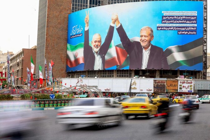 Above, a huge billboard depicts Iranian President Masoud Pezeshkian, right, and slain Palestinian Hamas leader Ismail Haniyeh at Tehran’s Valiasr Square on Aug. 12, 2024
