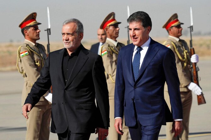 Stepping off his plane in Irbil, the capital of Iraqi Kurdistan, Pezeshkian was welcomed by regional president Nechirvan Barzani on a red carpet lined with Kurdish Peshmerga forces standing at attention with rifles at their sides.