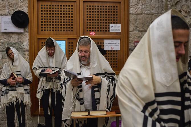 Ultra orthodox Jewish men pray during the mourning ritual of Tisha B'Av at the Western Wall in Jerusalem's Old City.