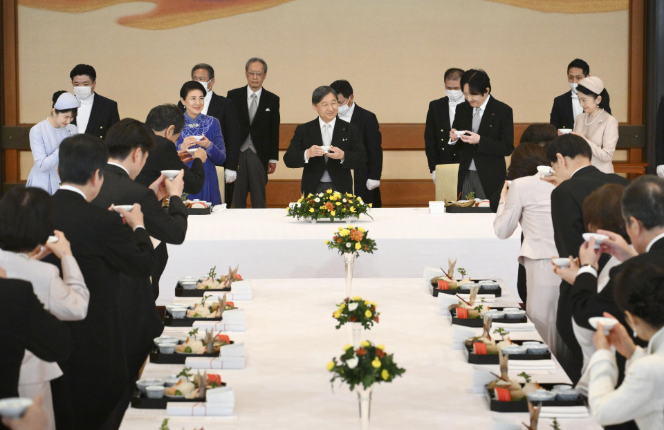 Japanese Emperor Naruhito (C) makes a toast at a ceremony held at the Imperial Palace in Tokyo on Feb. 23, 2025, to celebrate his 65th birthday.