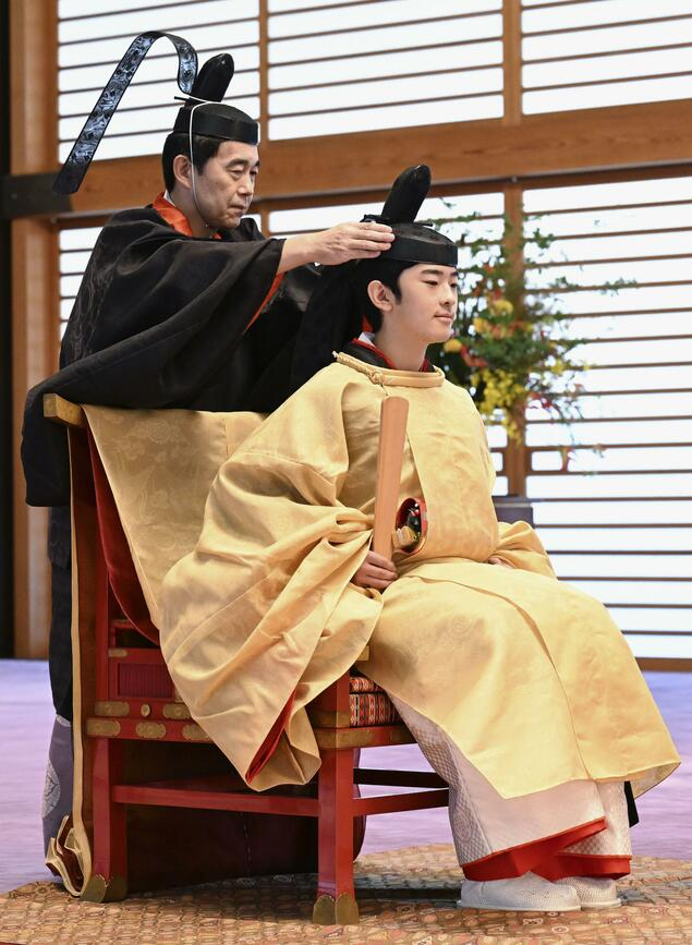 At a ritual for receiving a crown marking his coming of age, attendants removed a black silk headband from the head of the seated Prince Hisahito and replaced it with an adult crown bestowed by Emperor Naruhito. The emperor and his wife, Empress Masako, as well as the prince’s parents, Crown Prince Fumihito and Crown Princess Kiko, served as witnesses.