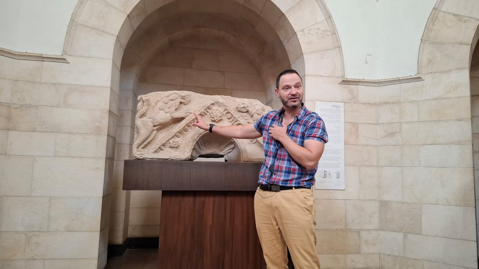 As the visitors enjoyed looking at the impressive archaeological artifacts spanning centuries, the tour guide invited the group to a corner of a colonnade, directing their attention to a modest stone set on a low pedestal.