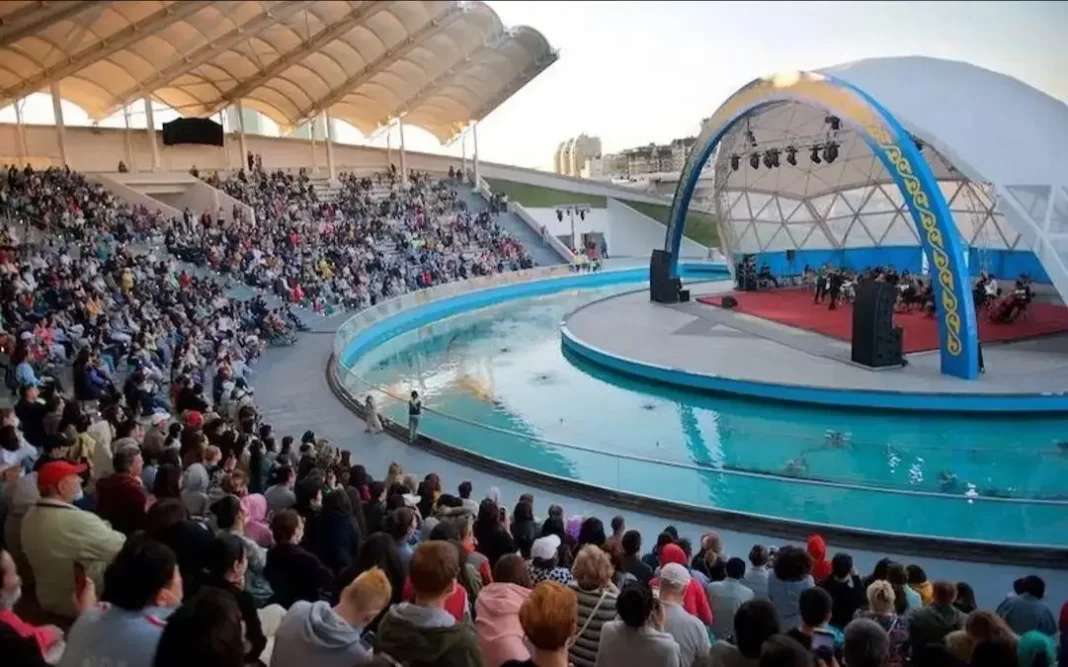 The amphitheater on the Esil River embankment is a venue for summer performances, hosting a wide range of events from children’s competitions to concerts featuring renowned artists. Decorative fountains surrounding the stage create a vibrant atmosphere, especially in the evening. The amphitheater’s design includes a suspended canopy that appears to defy gravity and protects the audience from the elements. Additionally, spectators are treated to a scenic view of the embankment, enhancing the experience. Overall, this amphitheater offers an exceptional setting for summer entertainment, combining artistic performances, fountains, and architectural elegance.