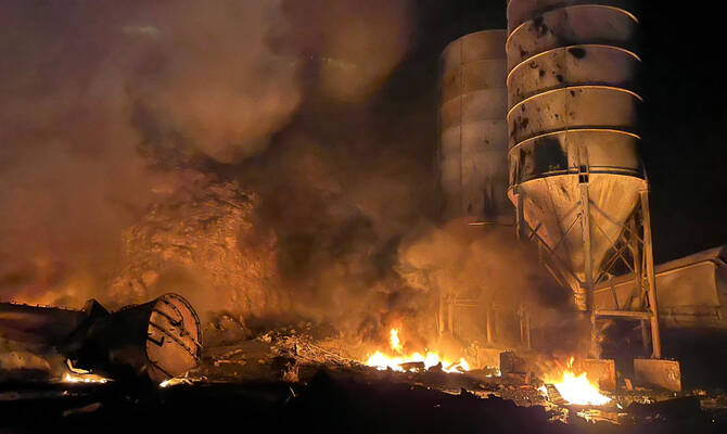 A photograph taken on October 16, 2025 shows a fire burning a cement manufacturing complex following a series of Israeli airstrikes