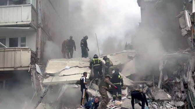 This handout photograph released on May 12, 2024, on the official Telegram account of the Belgorod region governor Vyacheslav Gladkov, shows firefighters operating on the site of an apartment building which partially collapsed after being damaged by a Ukrainian strike in Belgorod. - At least 17 people were injured, in the partial collapse of a building in Belgorod, near the Ukrainian border, after a strike by the Kiev army, Russian Health Minister announced. (Photo by Handout / Telegram / @vvgladkov / AFP) / RESTRICTED TO EDITORIAL USE - MANDATORY CREDIT "AFP PHOTO / TELEGRAM ACCOUNT @VVGLADKOV" - NO MARKETING NO ADVERTISING CAMPAIGNS - DISTRIBUTED AS A SERVICE TO CLIENTS