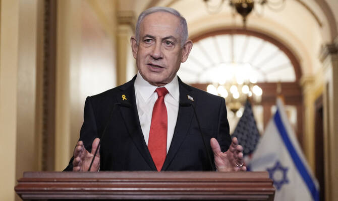 Israeli Prime Minister Benjamin Netanyahu speaks to the press at the US Capitol.