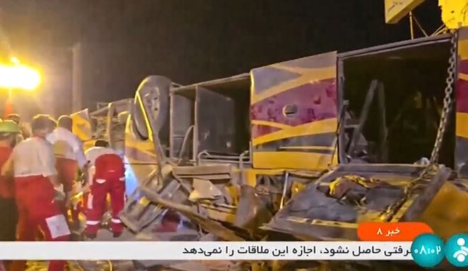 In a state TV report, Mohammad Ali Malekzadeh, a local Iranian emergency official, blamed the crash on the bus brakes failing and a lack of attention by the driver. A surveillance video later aired by the state TV showed the bus speeding past a parked car into a dirt lot just before the crash, narrowly missing bystanders.