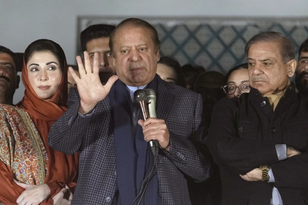 Pakistan’s Former Prime Minister Nawaz Sharif, center, addresses supporters next to his brother Shehbaz Sharif, right, and daughter Maryam Nawaz, in Lahore, Pakistan, Friday, Feb. 9, 2024. Former Prime Minister Nawaz Sharif was reelected president of Pakistan’s ruling party Tuesday. He last led the Pakistan Muslim League-N party in 2017, when he was forced out of office while facing corruption allegations.