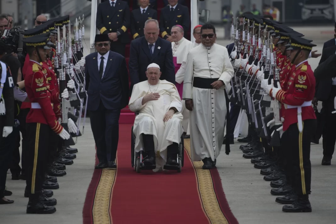 After an overnight flight from Rome, Francis was wheeled off the plane in his wheelchair and onto the tarmac for a welcoming ceremony under Jakarta’s perennial hazy, humid and polluted skies.