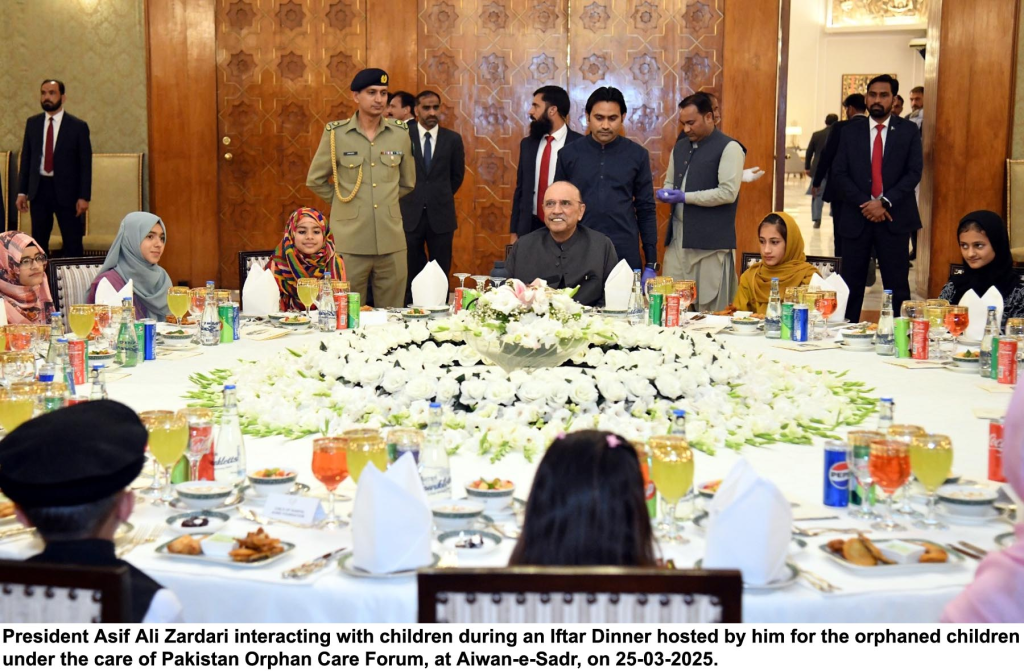 computer tablets to the children, emphasizing their use for educational purposes. “I urge all children to use these tablets, being gifted on First Lady Aseefa Bhutto Zardari’s suggestion, for learning and personal growth,” he added. The President said the children were as dear to him as his own and encouraged them to pursue education with dedication. The President also met with the children individually, expressing affection and reinforcing his commitment to their well-being. Air Marshal (Retd.) Farooq Habib, Chairman of the Pakistan Orphan Care Forum (POCF), highlighted the pressing issue of orphaned children in the country. “There are an estimated 4.6 million orphaned children in Pakistan,” he said. He said that POCF and its affiliated organizations were currently supporting nearly 120,000 children nationwide. Mr Farooq Habib emphasized the forum’s advocacy for orphaned children’s rights and called upon society to take collective responsibility for their care. “Providing for orphaned and underprivileged children is a shared duty,” he said. The Chairman thanked the President for his support and for hosting the orphaned children at an Iftar Dinner at Aiwan-e-Sadr.
