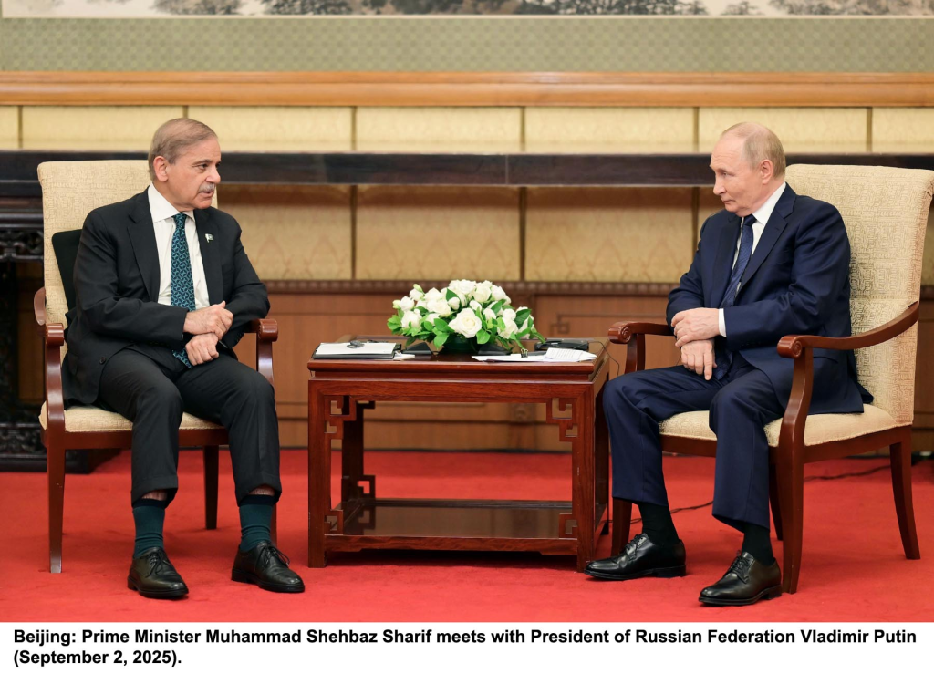 Beijing, China – September 2, 2025 — Prime Minister of Pakistan, Muhammad Shehbaz Sharif, met with President of the Russian Federation, Vladimir Putin, on the sidelines of a multilateral gathering in Beijing today. The two leaders held wide-ranging discussions aimed at deepening bilateral cooperation and reaffirmed their commitment to further strengthening the Pakistan-Russia relationship.