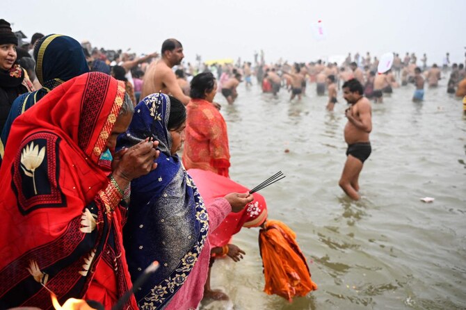 Hindu pilgrims take a dip in the sacred waters of Sangam, the confluence of Ganges, Yamuna and mythical Saraswati rivers during the Maha Kumbh Mela festival in Prayagraj on Jan. 13, 2025.