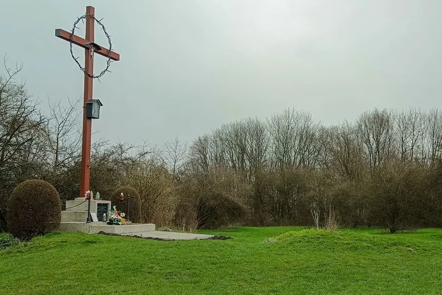 A metal cross on a meadow in the former German concentration and forced labor camp Plaszów.