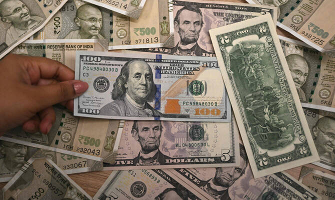 A foreign exchange employee displays Indian rupee and US dollar currency notes at an office in New Delhi