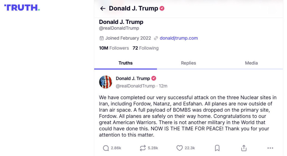 Screenshot taken from U.S. President Donald Trump’s Truth Social platform shows his post announcing that the U.S. military has attacked three nuclear sites in Iran.
