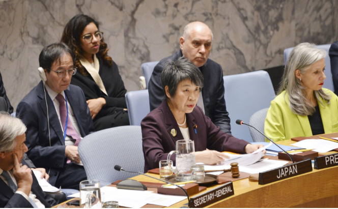 Japanese Foreign Minister Yoko Kamikawa (C, front row) chairs a U.N. Security Council meeting