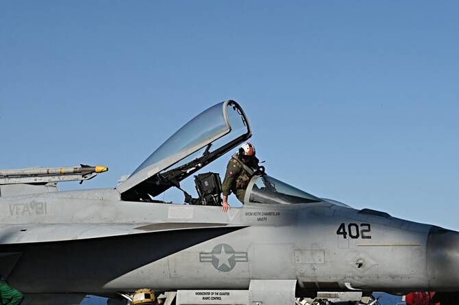 A pilot enters a F/A-18 Hornet jet as it prepares to take off from the deck of aircraft carrier USS Harry S. Truman.