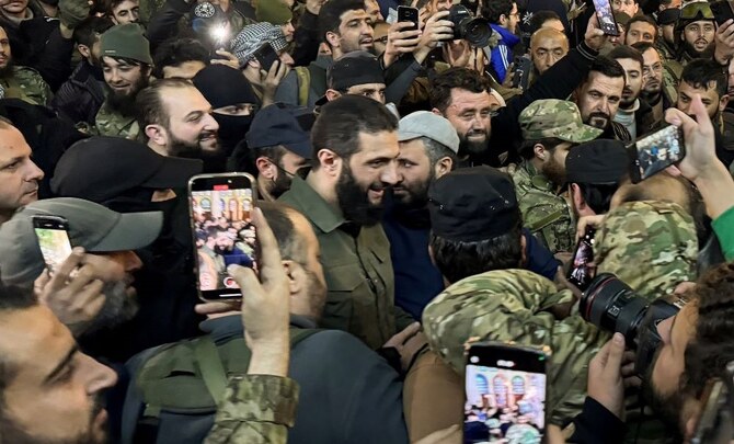 Abu Mohammed Al-Golani greets supporters in Ummayad Mosque, Damascus, Syria, Dec. 8, 2024.
