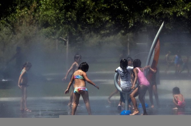Children cool off at a fountain in the Madrid Rio park amid heatwave conditions in Madrid on July 23, 2024.
